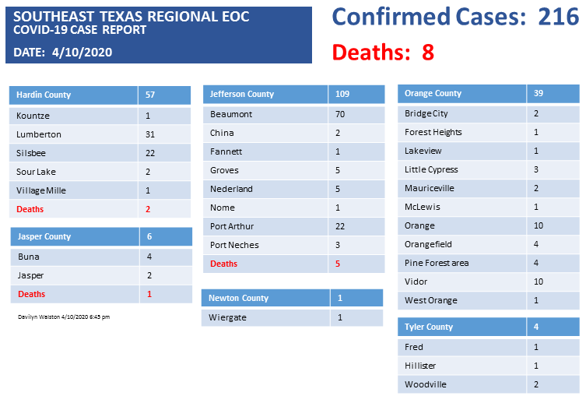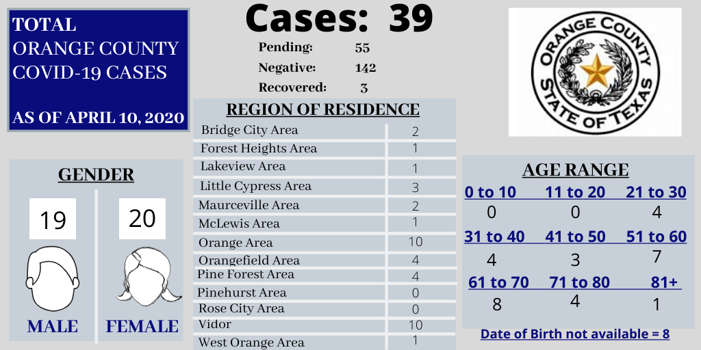 Of the 39 cases reported on April 10, 19 have been male and 20 female. And the ages range from the 21 to 90.